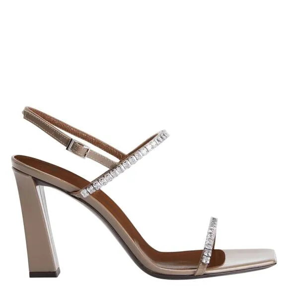 Patent leather slingback sandals with rhinestone chain applique and block heel. Taupe-coloured patent leather Strap with adjustable silver-coloured metal buckle Silver-coloured metal chain detail and crystal-coloured rhinestones Heel height: 90 mm. Taupe patent leather-covered heel Brown leather sole with logo Made in Italy Shoes are brand new in original box with dustbags. Giuseppe Zanotti website converts a 40 to a US 10.