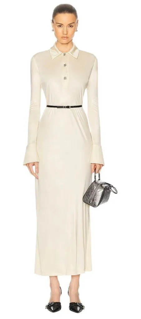 Givenchy's midi dress is cinched by a skinny belt fans of the label may recognize from its 'Voyou' bags. Cut from satin-jersey, it has a collared neckline and trio of buttons carved to depict its signature '4G' logo. 100% viscose Made in Italy Dry clean only Unlined Partial front button closure High shine jersey fabric with detachable satin waist belt Our Style No. GIVE-WD192 Manufacturer Style No. BW223C311B105 Color: Ivory MSRP: $2150.00 Features: • Totally Sold out on FWRD! Size: Womens 38 Condition: New With Defects 2 tiny stitches at left shoulder sleeve. Tags: night out, party, event, date night, sexy, bodycon, graduation, mini, cocktail, going out, bright colorful, fancy, wedding guest, sheath, brunch, bachelorette, simone, rush, sorority, designer, luxury, high end, runway