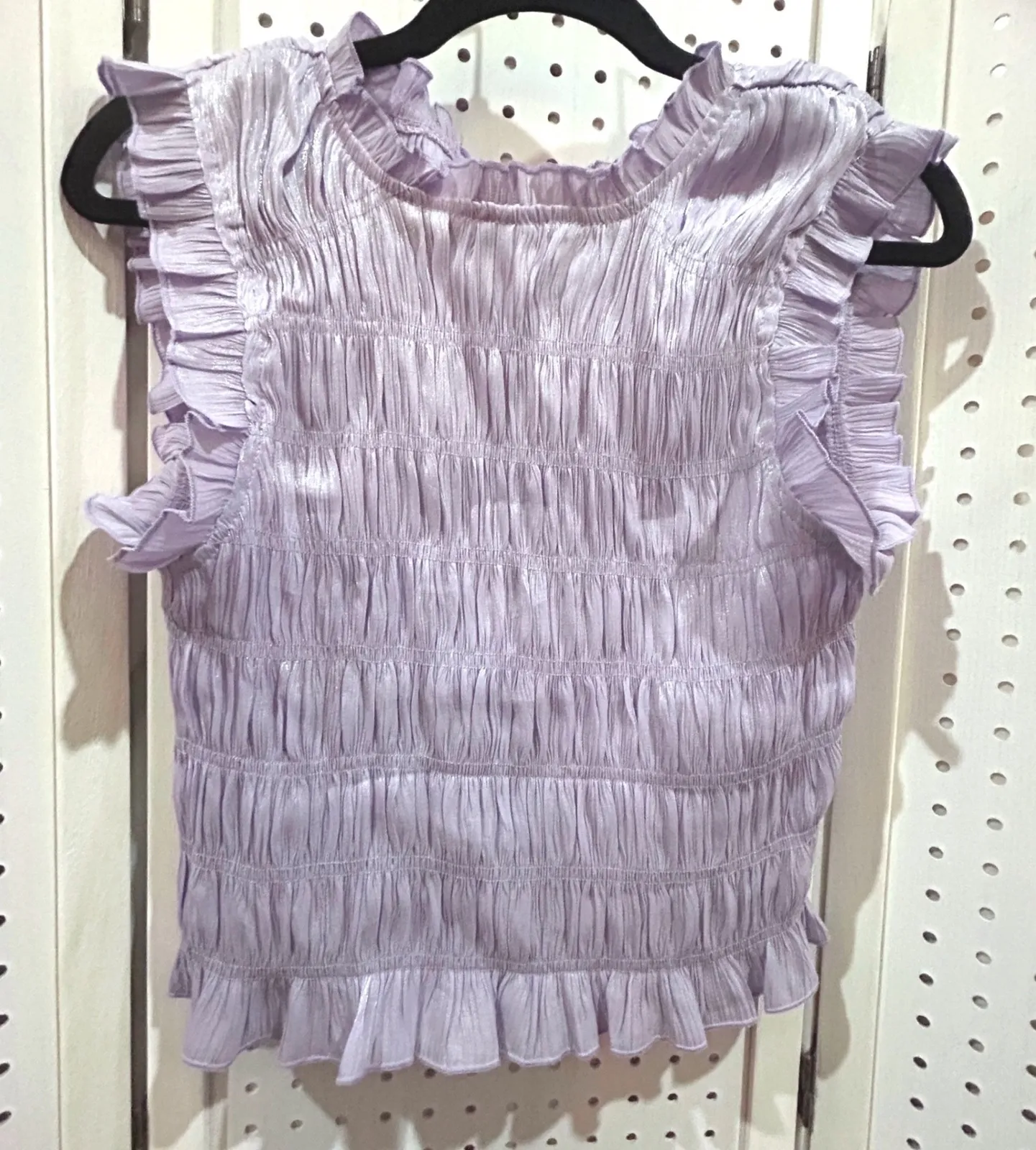 Like new condition. With stretch. purple shimmer ruched sleeveless top with ruffle neckline. This top features a flattering smocked bodice and ruffle trim on the neckline and armholes. Perfect for a brunch date or a night out with friends. Measurements: • Bust: 14 in • Length: 20 in • Waist: 12 in Type: Blouse Department: Women Style: Cropped Material: Polyester Blend Neckline: High Neck Sleeve Length: Sleeveless Sleeve Type: Flutter Sleeve Pattern: Solid Accents: Ruffle Features: Stretch Fit: Slim Fabric Type: Satin Occasion: Casual, Party/Cocktail Closure: Pullover Season: Summer, Spring