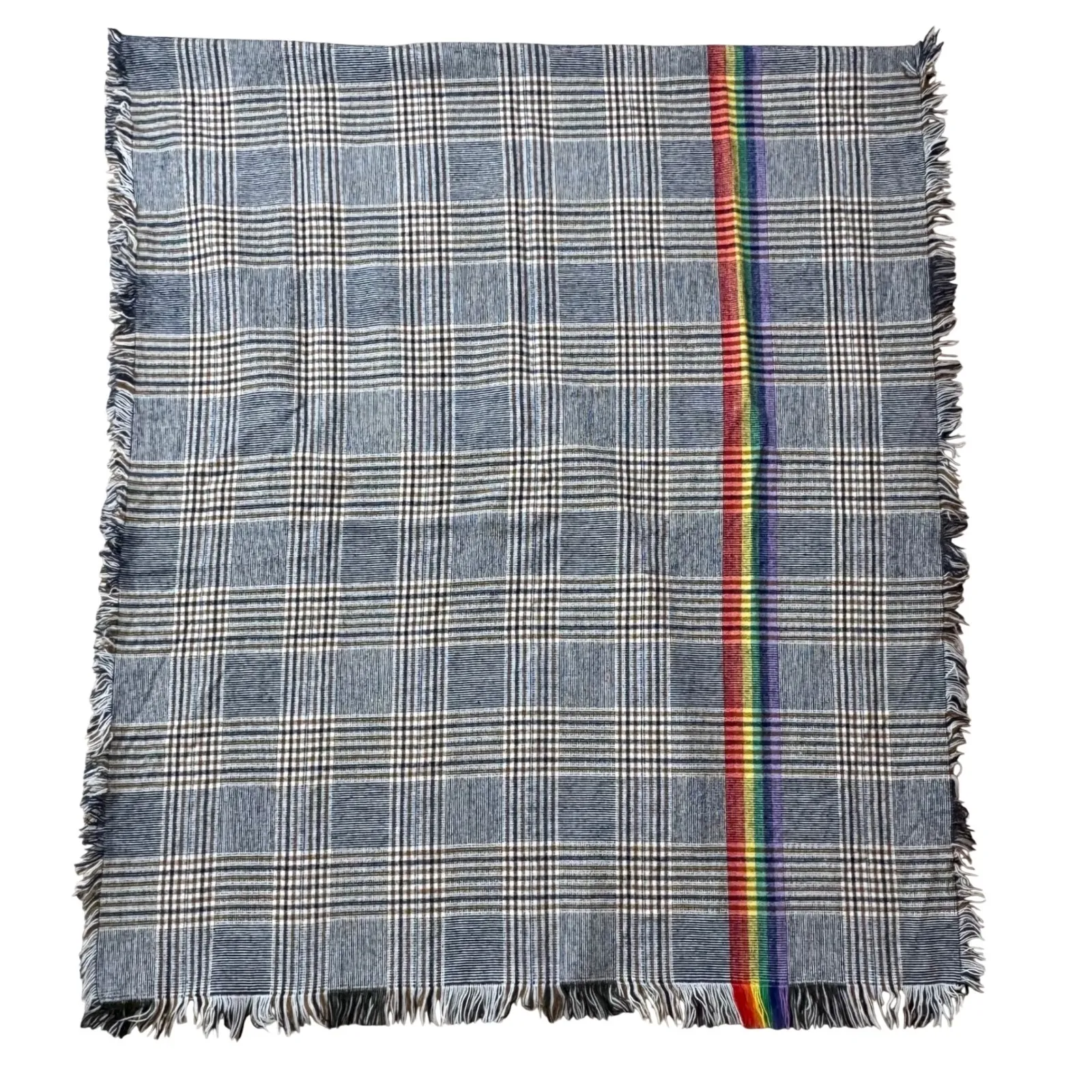 Condition: Excellent Type: Scarf Department: Unisex Size: 77"x 33" Material: Wool Style: Rectangle Scarf Pattern: Plaid Accents: Fringe Season: Fall, Winter Keywords: plaid scarf, blanket scarf, rainbow stripe, fringe accent, oversized scarf, winter accessory, cozy, warm, fashionable, gift idea, travel, casual wear, chic, statement, pride, preppy, academia, indie, indiesleaze
