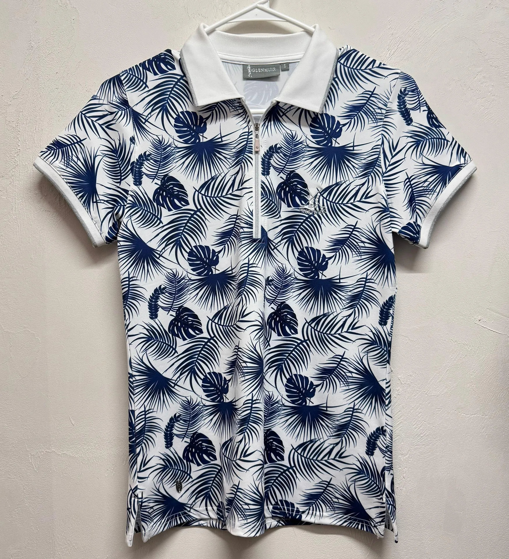 The Open Luxury Ladies Quarter Zip Print Patterned Performance Golf Polo Shirt - Like new condition - white / navy tropical print - size small - 88% performance polyester 12% elastane - Zip collar and cuffs with lurex tipping - High shine zip with diamante puller - Glenmuir Lady embossed logo plate above right hem #golf #pro