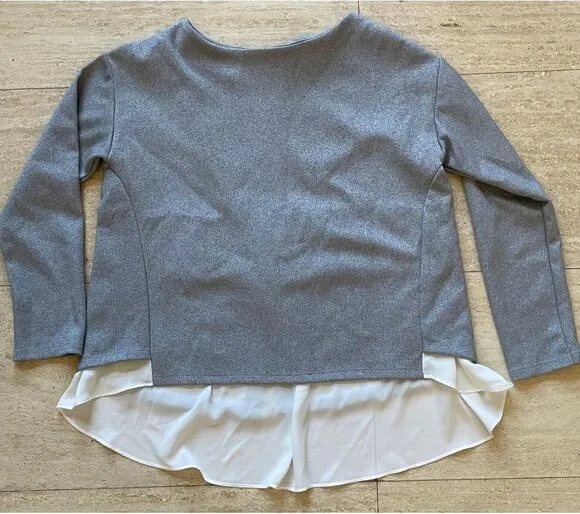 Stylish Global Work gray long sleeve top with a unique layered design. Features a white underlay for a chic contrast effect. Perfect for casual office wear, weekend outings, or layering in cooler weather. The versatile design allows for easy pairing with various bottoms. Ideal for achieving a polished yet comfortable look. Suitable for multiple seasons and occasions. Keywords: Global Work, layered top, long sleeve, gray, white underlay, office wear, casual chic, versatile, medium size, women's fashion