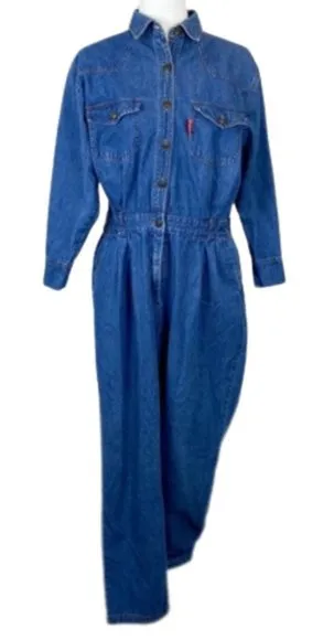 Gloria Vanderbilt Denim Retro Vintage 90s Jumpsuit Party Dark Wash Jeans Pants L PRE-LOVED, EXCELLENT CONDITION * BRAND: Gloria Vanderbilt * Size: large * Midweight * Collared neck with front half-length zipper * Long sleeves * 100% cotton * Multiple pockets * Elastic-cinched waist plus belt loops FLAWS: * None APPROX., FLAT LAY * Underarm-to-underarm: 20" * Waist: 17" * Inseam: 28" STYLE TAGS: retro, vintage jumpsuit, 90s, denim jumpsuit, Gloria Vanderbilt jeans
