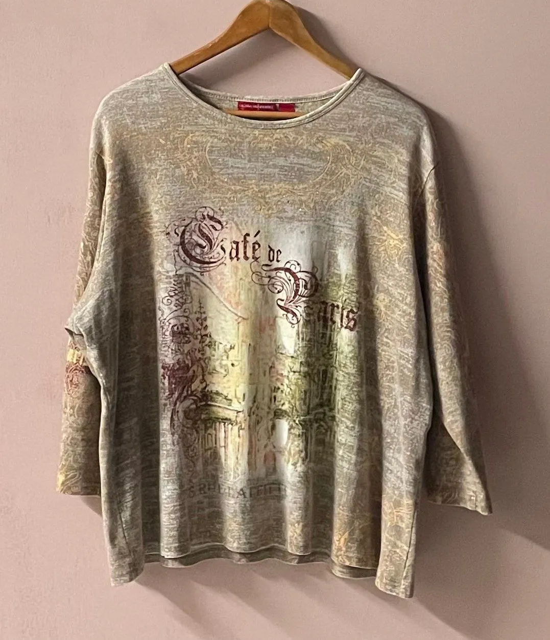 Casual cute Y2K 3/4 sleeve with a muted tan/blue graphic print all over and Café de Paris printed in... Show more