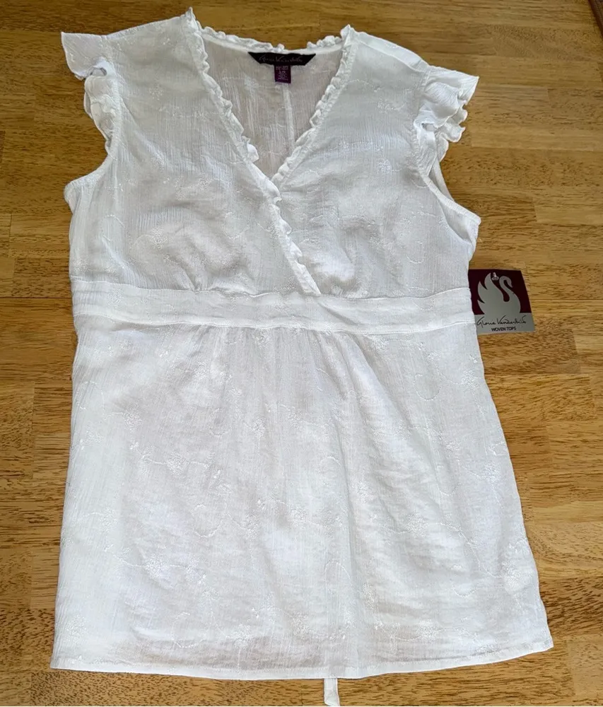 Gloria Vanderbilt white Rayon cap sleeve babydoll blouse Vneck ruffle edge large - $10 New With Tags - From Kim