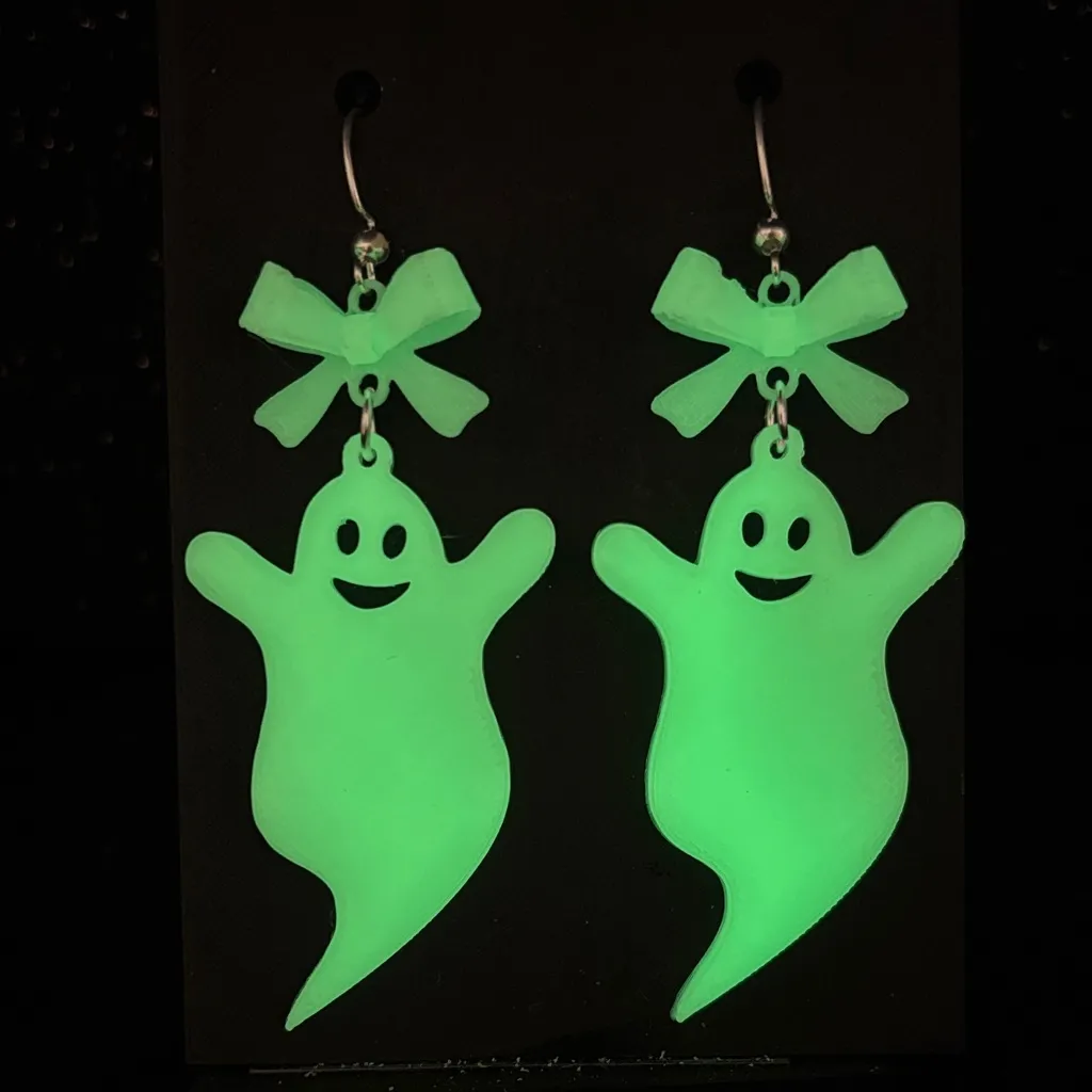 Boo-tiful and glowing! These Glow in the Dark Ghost Earrings with Bow are the perfect mix of spooky and sweet. Handmade with lightweight 3D-printed material, each ghost features an adorable bow and a soft glow that shines brightest after charging under UV or blacklight. Ideal for Halloween parties, ghost lovers, or anyone who adores cute spooky accessories! ✨ Details: • Handmade with high-quality 3D printing • Glows in the dark (best under UV or blacklight) • Lightweight and comfy for all-day wear • Approx. Length: 3 in | Width: 1.75in • Nickel-free, hypoallergenic hooks 👻 Add a little spooky sparkle and ghostly glow to your Halloween look — perfect for festive nights and year-round cute-ghoul style! D415