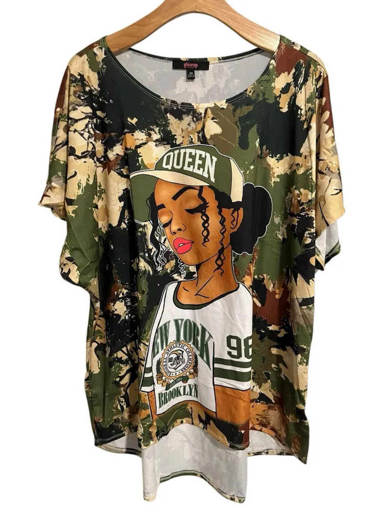 In brand new in bag condition, there are no issues or flaws. Top of shoulder to bottom hem measurement (front) is approximately 27.5 inches. Top of shoulder to bottom hem measurement (back) is approximately 32.5 inches. Armpit to armpit measurement is approximately 26 inches. Elevate your casual wardrobe with the Glowup Couture T-Shirt, designed for the modern woman who values both style and comfort. This relaxed-fit tee comes in a playful camouflage pattern with vibrant graphics that add a pop of personality to any outfit. It's crafted from a blend of polyester and spandex, offering a breathable and lightweight feel that's perfect for all-day wear. The T-shirt features a round neck and short casual sleeves, making it an ideal choice for any season. Easy care is a priority with this piece, as it's machine washable and constructed with stretch microfiber that maintains its shape and color through regular wear and washing. Embrace effortless fashion with this versatile and comfortable piece from Glowup Couture's collection. Item#8121
