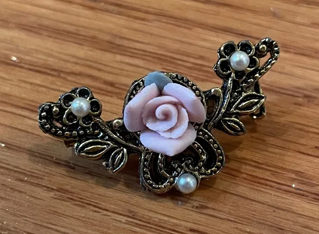 Vintage Porcelain Rose Brooch Pin | Gold-Tone Filigree | Faux Pearls | Romantic Cottagecore Delicate and timeless, this vintage-style brooch features a hand-crafted pink porcelain rose surrounded by faux pearls and intricate gold-tone filigree detailing. A beautiful statement piece that adds a touch of romance to any outfit — perfect for collectors or anyone who loves that soft, feminine vintage charm. ✨ Details: • Gold-tone metal with ornate filigree design • Pink porcelain rose centerpiece • Accented with 3 faux pearls and a crown topper • Secure clasp — fully functional • Condition: Excellent vintage condition, no missing stones Style it on a scarf, hat, jacket, or sweater for a sweet romantic accent. 📦 Ships fast from a smoke-free home! 🎁 Bundle & save on shipping! #VintageBrooch #PorcelainRose #CottagecoreJewelry #RomanticStyle #FauxPearls #GoldTone #VictorianStyle #FeminineAccessories #FloralJewelry #TimelessStyle #CollectibleBrooch