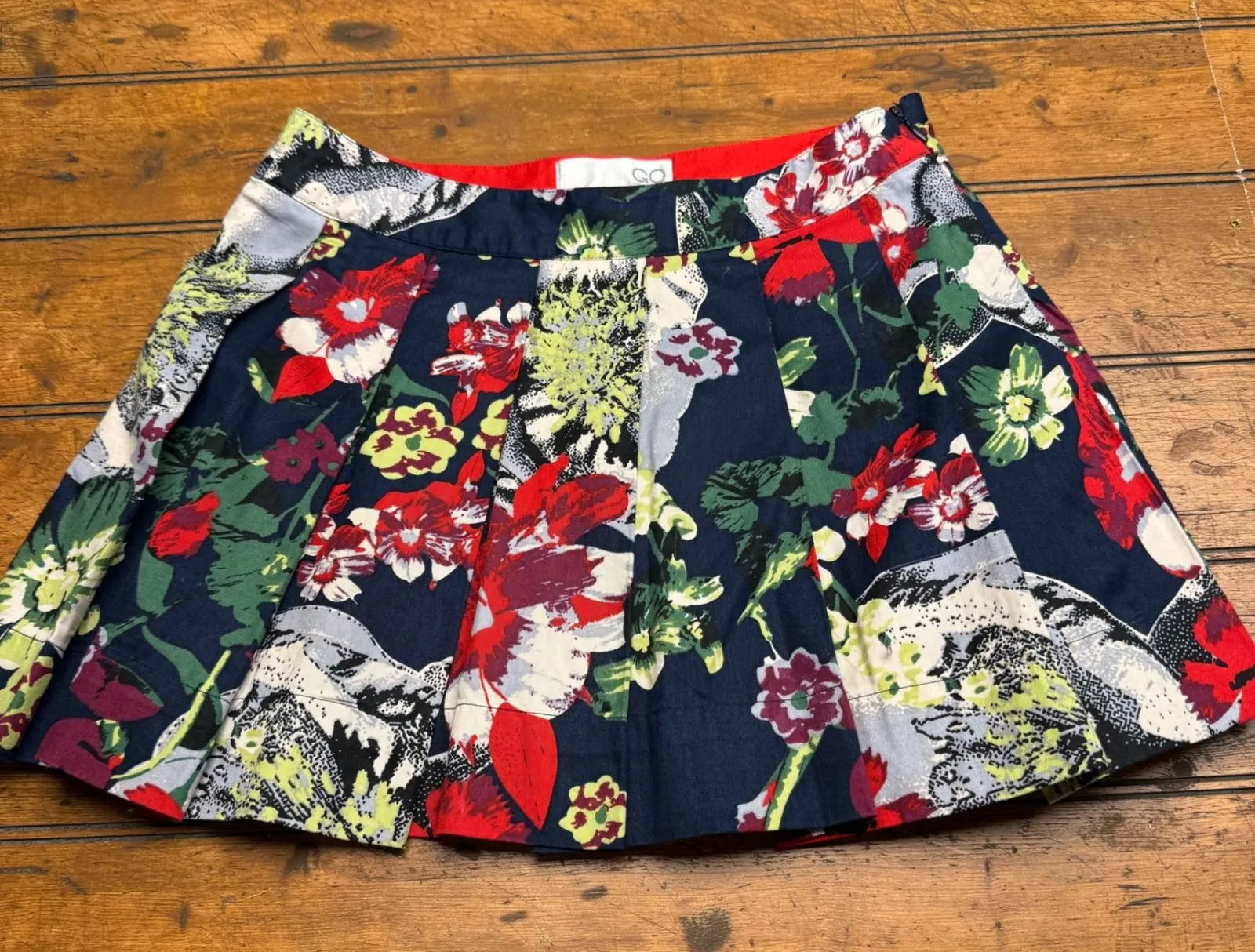 Capture attention with this vibrant GO International pleated skirt, a symphony of bold floral blooms in navy red and yellow. The playful pleats create a flattering silhouette that moves beautifully with you, while the eye-catching print ensures you stand out. Imagine twirling through a summer garden party or adding a pop of color to a casual brunch outfit. Perfect for a sunny afternoon outing or a stylish day Type: Skirt Style: Pleated Skirt Length: Short Department: Women Material: Cotton Pattern: Floral Accents: Zipper, Pleated Features: Lined Theme: Flower, Bohemian, Art Closure: Zip Occasion: Casual, Party/Cocktail Keywords: pleated skirt, floral skirt, midi skirt, summer skirt, garden party, brunch outfit, workwear, daytime dress, bold print, colorful, feminine, playful