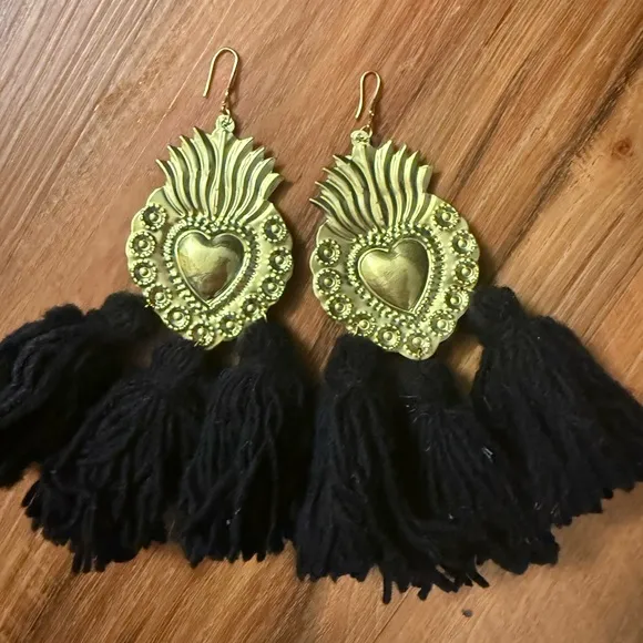 Elegant gold and black earrings featuring a heart design with tassels. Perfect for adding a touch of sophistication to any outfit. Sacred hearts with wool really light and unique Originally from Oaxaca Mexico Smoke and pet free They are new without tags
