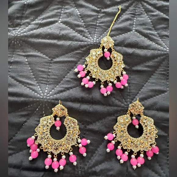 Elegant gold chandelier earrings adorned with vibrant pink beads. Perfect for adding a touch of glamour to any outfit. Indian Pakistani Bangladeshi luxury designer bridal shaadi wedding jewelry set with beautiful stones and embellishments. Has thick 22k gold plating and will not tarnish easily. Disclaimer: As it’s a heavy piece, may have missing embellishments but none are visibly noticeable. Includes a tikka (head piece) and earrings.