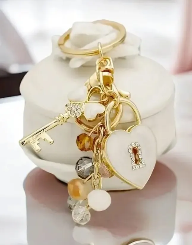 Add a touch of elegance to your everyday accessories with this Gold & White Heart Charm Keychain, brand new with tags. Featuring a glossy white heart pendant, crystal accents, a gold-tone key charm, and decorative bead drops, this piece brings both style and personality to your keys, bags, and totes. Perfect for gifting or adding a chic touch to your purse. Features Gold-tone hardware White enamel heart charm with crystal detail Decorative beads and baubles Gold key charm accent Sturdy key ring + lobster clasp Condition: NWT / Never Used Perfect For ✔ Keychains & bag charms ✔ Purse decoration ✔ Gift giving ✔ Boutique accessory lovers #Keychain #BagCharm #HeartCharm #GoldAccessories #CuteAccessories #NWT #GiftIdea #PurseCharm #WomenAccessories #FrankieAndLu