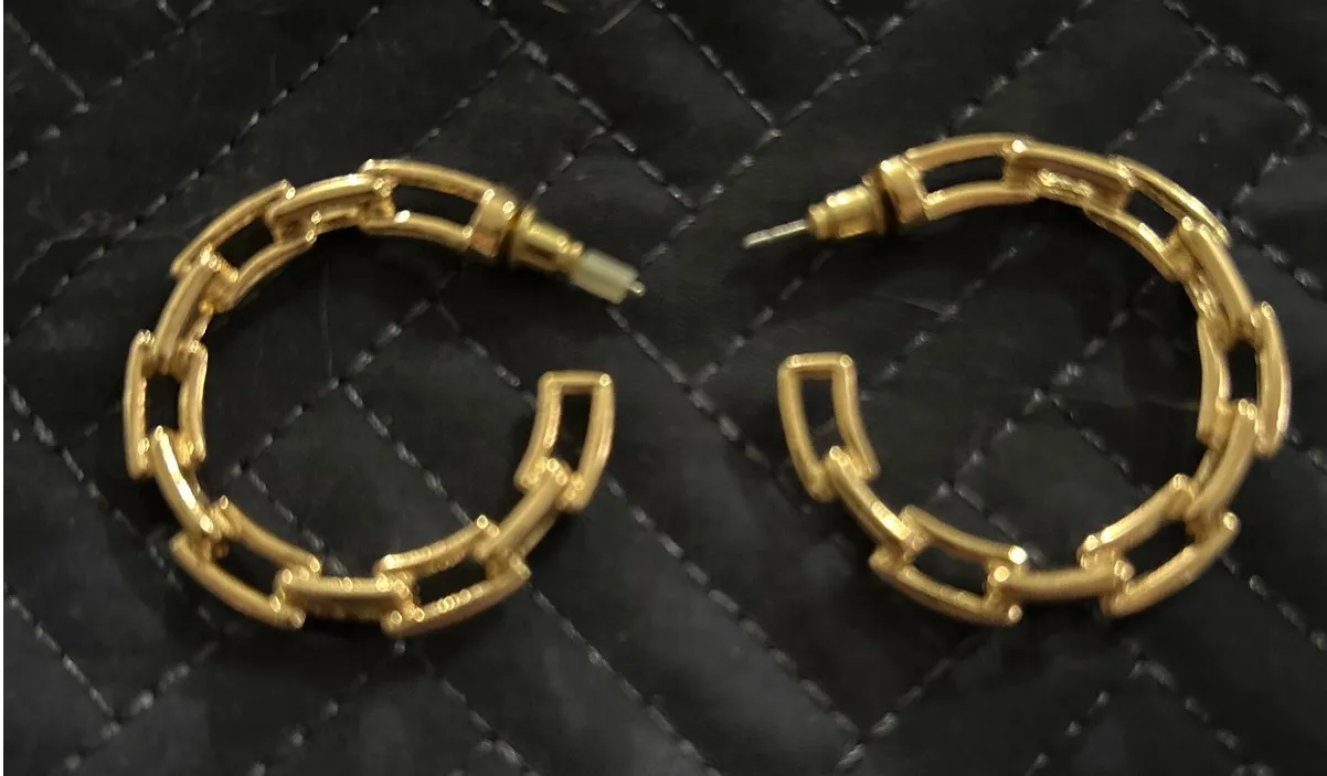 Elevate your everyday style with these chic gold chain link hoop earrings. The bold, interlocking design creates a statement look that is both modern and timeless. These earrings have a polished gold finish that catches the light beautifully, adding a touch of glamour to any outfit. Style: Hoop Type: Earrings Color: Gold Main Stone Color: Gold Closure: Butterfly Main Stone: No Stone Shape: Round Metal: Gold Plated Material: Metal Main Stone Shape: Round Setting Style: Bezel Country of Origin: China Ear Area: Lobe Main Stone Treatment: Not Enhanced, Unknown Cut Grade: Good Keywords: Gold earrings, Hoop earrings, Chain link earrings, Statement earrings, Fashion earrings, Gold hoops, Trendy earrings, Modern jewelry, Chunky hoops, Geometric earrings, Party earrings, Everyday earrings, Gift for her, Gold tone, Earring