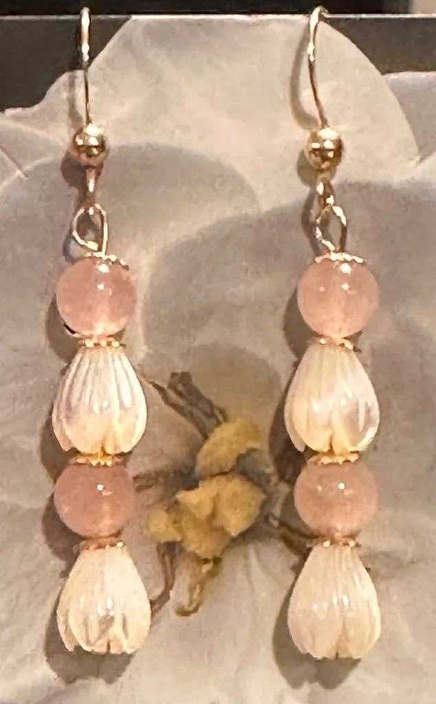 Gold Filled Pikake Mother of Pearl Rose Quartz Earrings Made on Maui Approximately 2.25” Mother of P... Show more