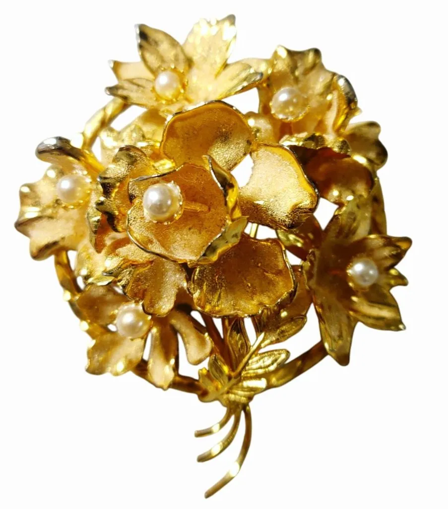 This delicately crafted vintage brooch features gold floral designs adorned with faux pearls. A timeless piece of Austrian craftsmanship, perfect for collectors or enhancing attire. • Made in Austria • Faux pearl accents • Gold-tone floral design • Secure pin-back closure • Approximately 2 inches in diameter Minor tarnish on gold-tone finish adds to its vintage charm. Diameter measures approximately 2 inches. ~Buyer Please Note ~ All items are professionally cleaned and ozone-sanitized before shipping, which may leave a light temporary scent. Most listings are pre-owned — Please feel free to request any additional details before purchasing. I respond quickly to all inquiries. Reasonable offers are always welcome.