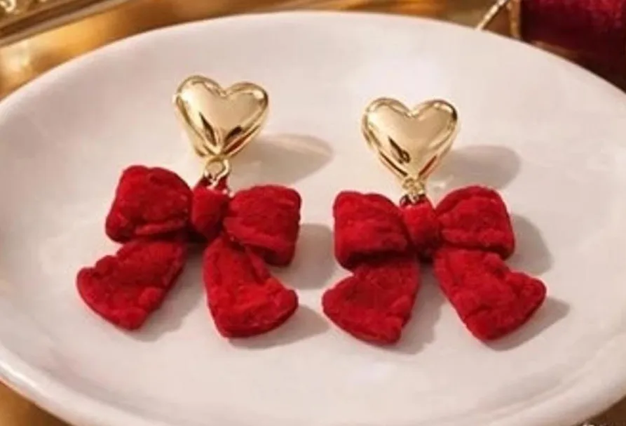 Gold heart stud earrings with a red velvet bow dangle, giving a cute coquette, Valentine’s Day, holiday party vibe. Lightweight look with a glossy gold-tone heart and plush velvet-style bow, perfect for date night, Christmas outfits, winter photos, or anyone into girly vintage-inspired accessories. Approx size: 2.8 cm tall (1.1 in) x 2.3 cm wide (0.9 in). Condition: new Notes: Metalhypoallergenic gold-tone finish with velvet-style fabric bow. coquette, bow earrings, velvet bow, heart earrings, gold heart stud, red bow, Valentine earrings, holiday earrings, feminine, kawaii, girly, vintage inspired