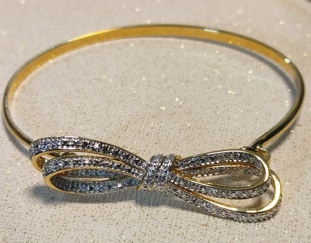 This intricately designed gold-plated bracelet celebrates elegance with a stunning rhinestone-embellished bow centerpiece. Crafted by Prime Art Jewel, its shimmering accents and delicate structure embody timeless sophistication and charm, making it an exquisite choice for refined accessorizing. • Gold-plated construction for durability and shine • Features a delicate bow design with rhinestone accents • Secure hinge clasp for easy wear • Lightweight and comfortable on the wrist • Classic and versatile design Size 7-8 Buyer Information All items are professionally cleaned and sanitized with an ozone treatment prior to shipping. Please note that this process may leave a light, temporary scent. The majority of my listings are pre-owned. Buyers are encouraged to request additional details or clarification before completing a purchase. I respond promptly to all inquiries. Reasonable offers are welcome and will be considered. Jewelry Testing Disclaimer: Gemstones are tested using the Presidium Duo Tester II. While this method confirms gemstone type, it cannot differentiate between natural and lab-created stones.