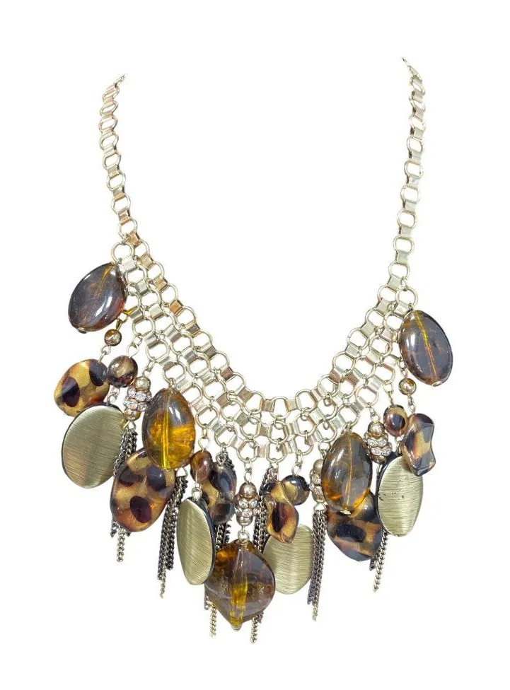 A striking accessory featuring amber and tortoiseshell beads paired with textured gold-tone accents.... Show more