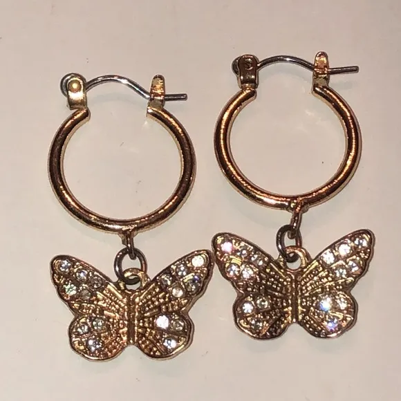 Gold Tone CZ Rhinestone Dainty Butterfly Hoop Boho Pierced Earrings - $20 - From Vault