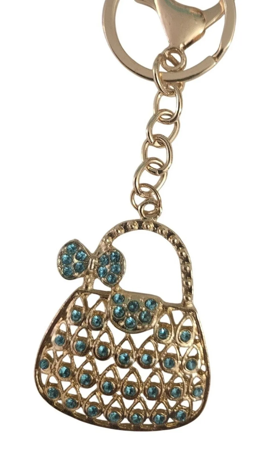 Adorn your keys with this charming handbag charm, a delightful accessory designed to bring a touch of sparkle to your everyday. The intricate cut-out design of the purse is beautifully embellished with vibrant blue rhinestones, catching the light with every movement. A sweet bow, also adorned with sparkling blue stones, sits atop the handle, adding a playful and feminine flair. This eye-catching keychain is perfect for adding personality to your car keys, purse, or backpack, making it a wonderful accent for a night out or a special occasion. Type: Key Chain Department: Women Theme: Bling, Letters, Numbers & Symbols Material: Metal, Crystal Accents: Bow, Rhinestone Pattern: Geometric Keywords: handbag charm, purse keychain, blue rhinestone, bow accent, gold tone, women's accessory, sparkly, feminine, gift idea, bag charm, fashion accessory, decorative keychain