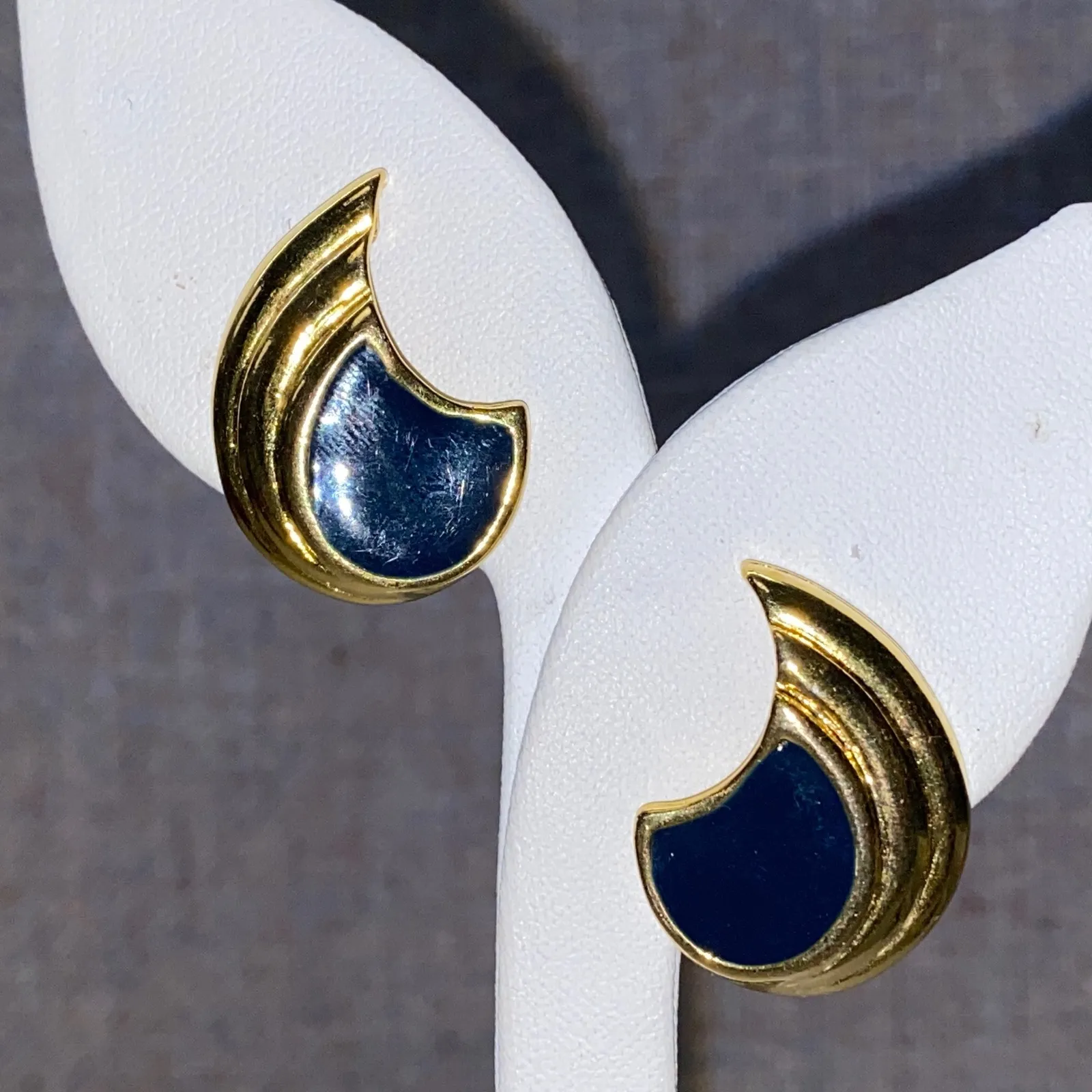 Preloved in excellent condition Please see all photos for close up details and measurement. Style: Dangle/Drop Main Stone Color: Blue Closure: Clip-On Main Stone: No Stone Metal: Yellow Gold Shape: Asymmetrical Material: Metal, Enamel Type: Earrings Main Stone Shape: Cabochon Setting Style: Bezel Ear Area: Lobe Keywords: gold earrings, clip earrings, navy blue, enamel earrings, designer style, statement earrings, fashion jewelry, elegant, sophisticated, vintage inspired, everyday wear, evening wear, women's accessories