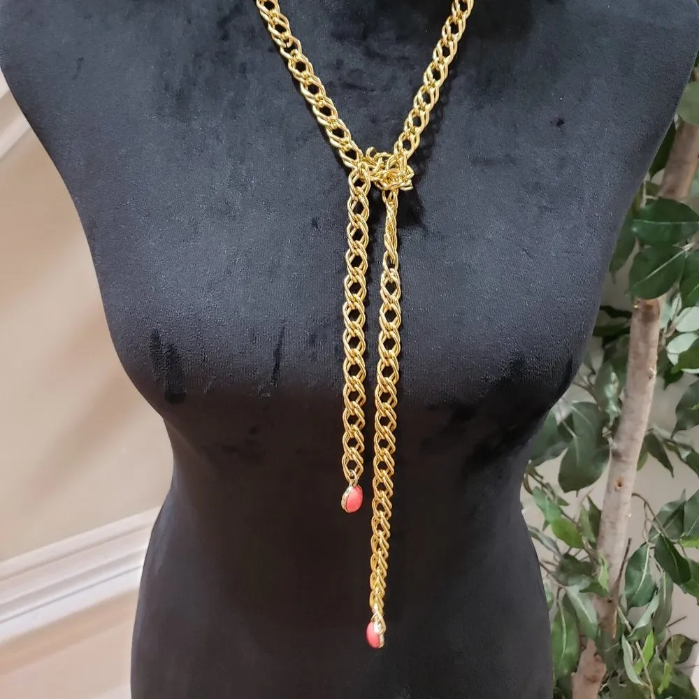 Gold Tone Tie a Knot Pink Chunki Gem Stone Lariat Style Long Chain Necklace - $27 - From Carissa