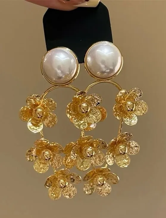 Golden Garden Floral Drop Earrings with Faux Pearl Studs – Soft Romantic Style Gold - $25 - From Shelley
