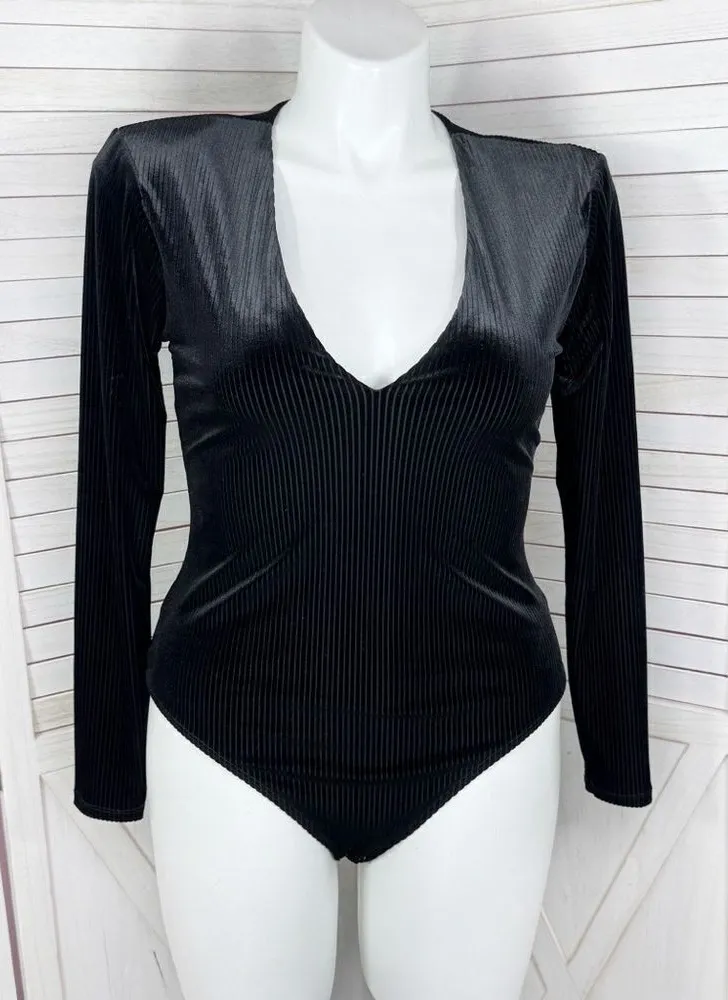 Good American All Day Ribbed Velvet Deep V Neck Bodysuit Black Size 4 XL Onyx jet black Ribbed s... Show more