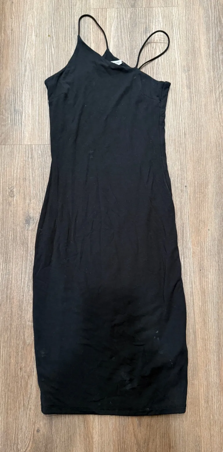 Keywords: Good American dress, black midi dress, bodycon dress, sleeveless dress, spaghetti strap dress, fitted dress, casual dress, womens dress, size 1 dress, black dress, midi length dress, summer dress, little black dress, party dress, night out dress
