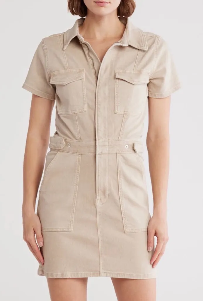 Good American Fit Success Khaki Safari Denim Utility Mini Jean Dress Sand S NWT. Jean material. Light sand color. Stay comfortable through work or play in this curve-hugging dress made from stretchy denim with snap placket, shapely seams and pockets galore. Front zip closure. Spread collar. Short sleeves. Chest button-flap patch pockets. Front scoop pockets; back patch pockets. Unlined. 72% cotton, 20% recycled cotton, 6% elasterell-p, 2% elastane. Machine wash. New with tags. Brand says the garment is TTS.