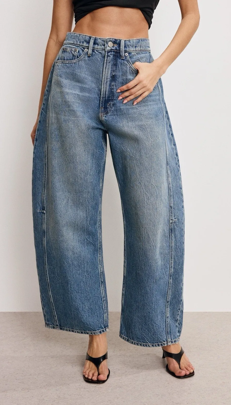 We recommend sizing up. High-rise Relaxed with extremely curved legs Clean hem Rigid denim Clas... Show more