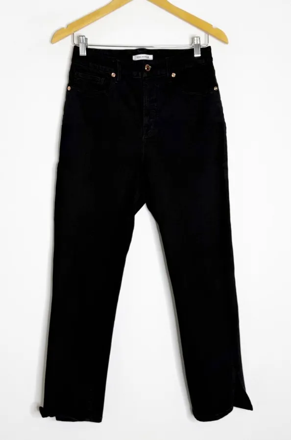 This pair features a versatile black wash with striking rose gold-tone hardware (rivets and button). The raw, side-split cropped hem gives them an edgy, modern flair. Crafted from a premium denim blend (91% Cotton, 6% Polyester, 3% Elastane) for comfort and fit.