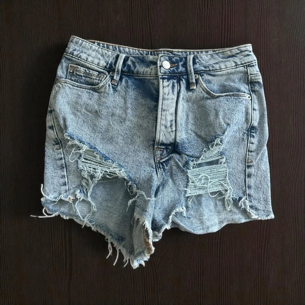 These stylish light wash distressed denim cutoff shorts by GOOD AMERICAN offer a trendy, casual look... Show more