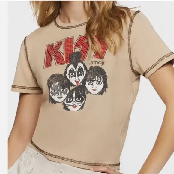 Kiss X Emoji Rhinestones Crop Retro Band Tee - Great condition, see all pictures! Measurements Lay... Show more