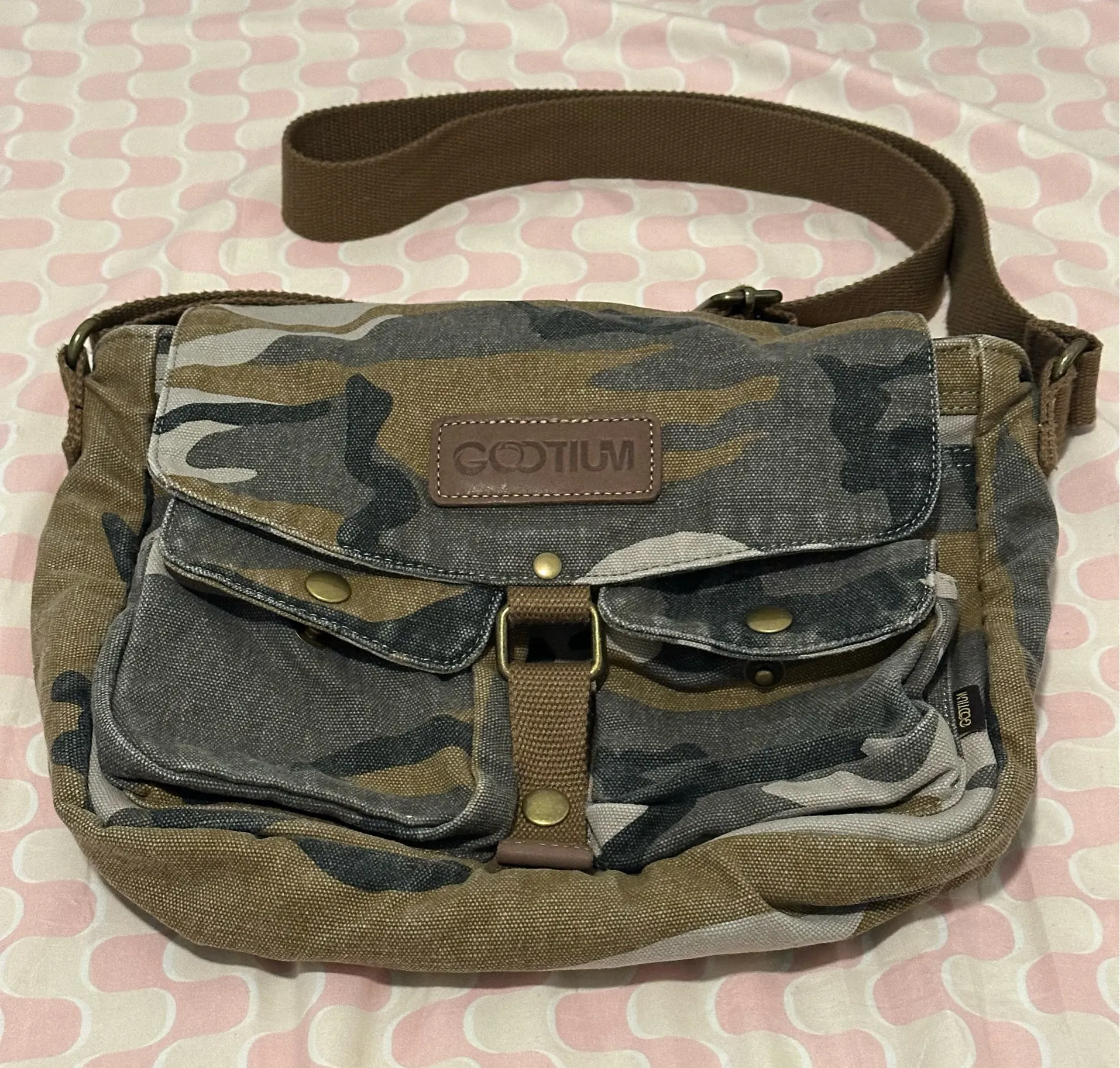 Gootium Camo canvas messenger bag - Vintage Crossbody Shoulder Bag Military Satchel #camo #crossbody #fall #art Used but in good condition Bought at $37.99 DIMENSIONS - 11.2"(L) x 3.4"(W) x 9"(H); Item weighs 1.1 Lbs; Fits iPad up to 9.7-inch and A4/foolscap-sized folders, textbooks, magazines in its main compartment. Used for less than 3 months but in good condition