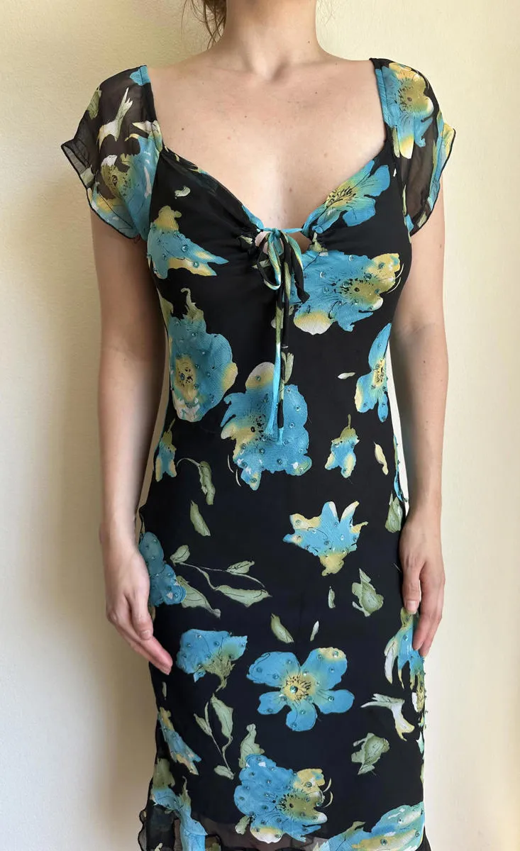 The most PERFECT silky mesh black and blue floral vintage cap sleeve dress. Lovely tie front bow mil... Show more