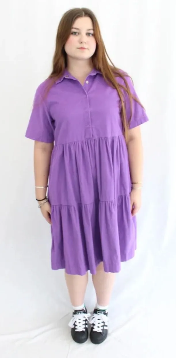 Size 12 AU = Size 8 US A stain on the back of the dress is pictured. Price reflects condition - no other flaws. 21.5" pit to pit 39.5" length Discover effortless charm in this vibrant purple corduroy shirt dress from Gorman. This delightful piece features a flattering tiered silhouette that flows gracefully, creating a playful and feminine look. The classic collar and button-front design add a touch of sophisticated structure, while the short sleeves offer comfort and versatility. Convenient side pockets add practicality to this stylish design. Perfect for casual outings brunch dates or relaxed weekend adventures. Key words: colorful funky emo corduroy twee