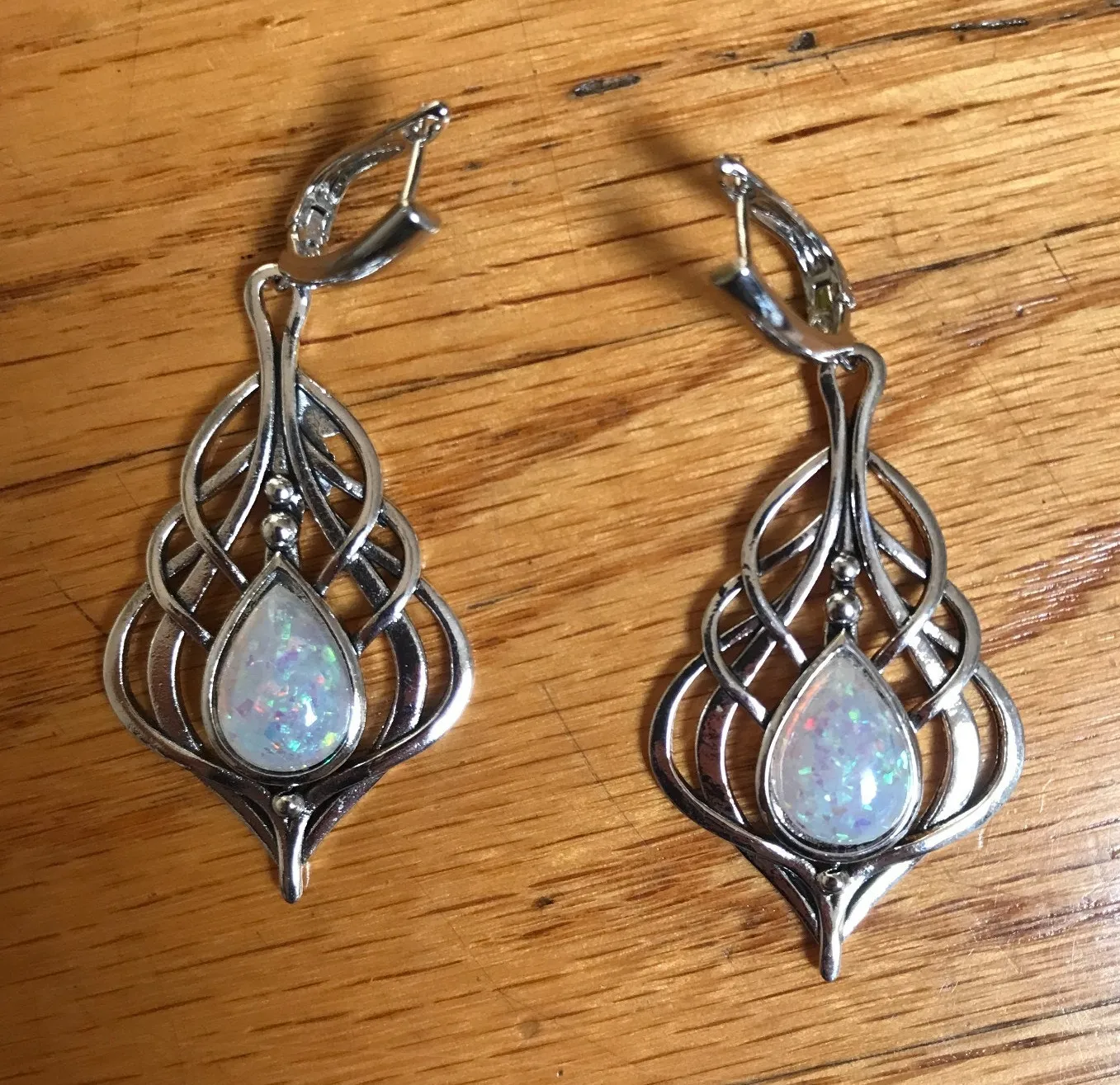 - Beautiful large silver-colored earring (zink alloy) - Elegant swirl design - Large faux moonstone in the middle (I believe it's resin) - For pierced ears - Brand new in the original baggie - One size, top of hook to bottom ~ 2.5" and 1.25" across