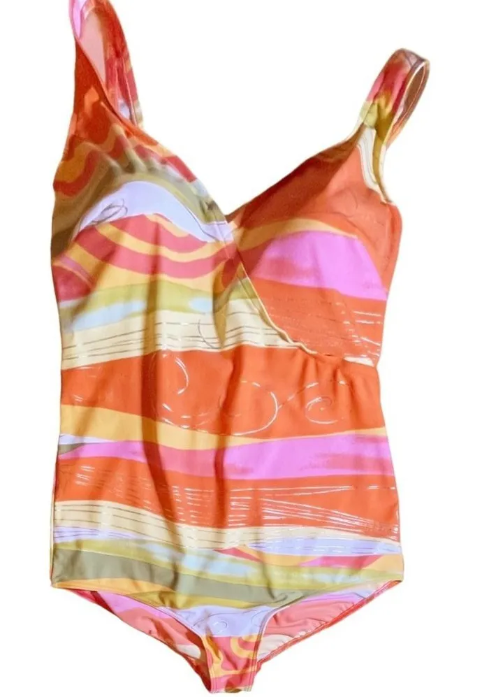 Gottex Silver one-piece swimsuit featuring fixed tank straps, full bottom coverage and a high scooped back. Painted desert print in orange, pink, yellow, turquoise and green with gold foil accents. Crossover neckline detail. 80% nylon, 20% spandex. Hand wash. Great preowned condition. BRAND: Gottex Silver SIZE: 22W COLOR: painted desert CONDITION: previously owned ORIGIN: Canada Marked sizes will vary by designer • Color may vary on your screen. •Fast Shipping •Small Business •Carefully Packaged, Smoke-Free •5-Star Seller Beach, Surf, Swimming, Vacation, Resort, Cruise, Poolside, Warm Weather, Spring Break, Lake Life, Honeymoon, Beachy, Flattering, Bathing Suit, Smoothing, Swimwear, Tropical, abstract