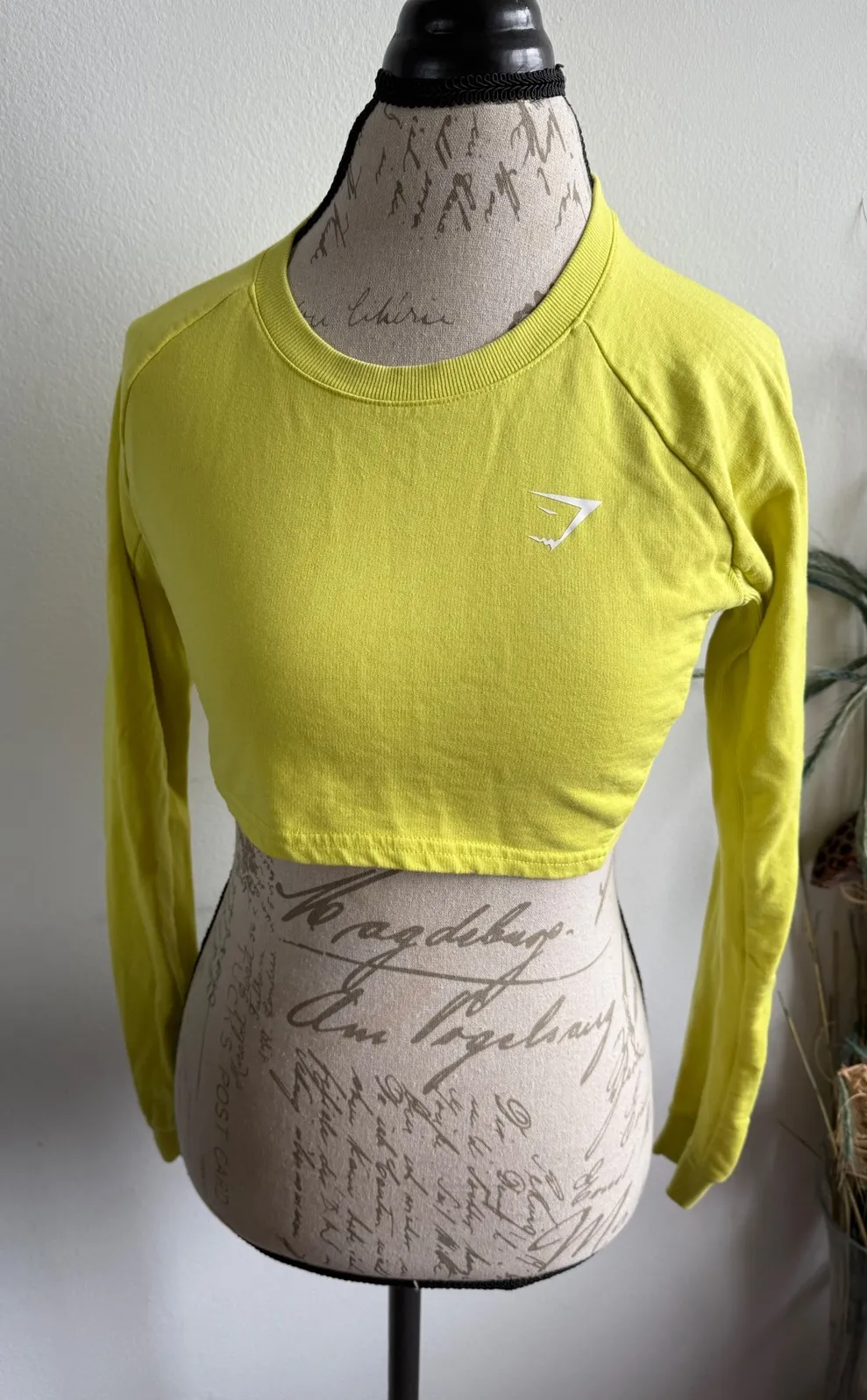 Keywords: Gymshark, crop top, long sleeve, activewear, athletic, workout top, yellow, exercise, fitness, running, yoga, XS, small, cropped, sportswear