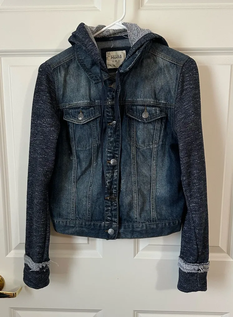 In great condition MUDD Denim Jacket Womens M Trucker Sweater Sleeves Hoodie Dark Wash Distressed. F... Show more