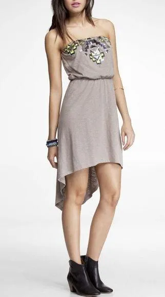 Brand New with Tags. Express Sequin Embellished Strapless Hi-Lo Hem Slub Knit Dress in Tan Brown. Th... Show more