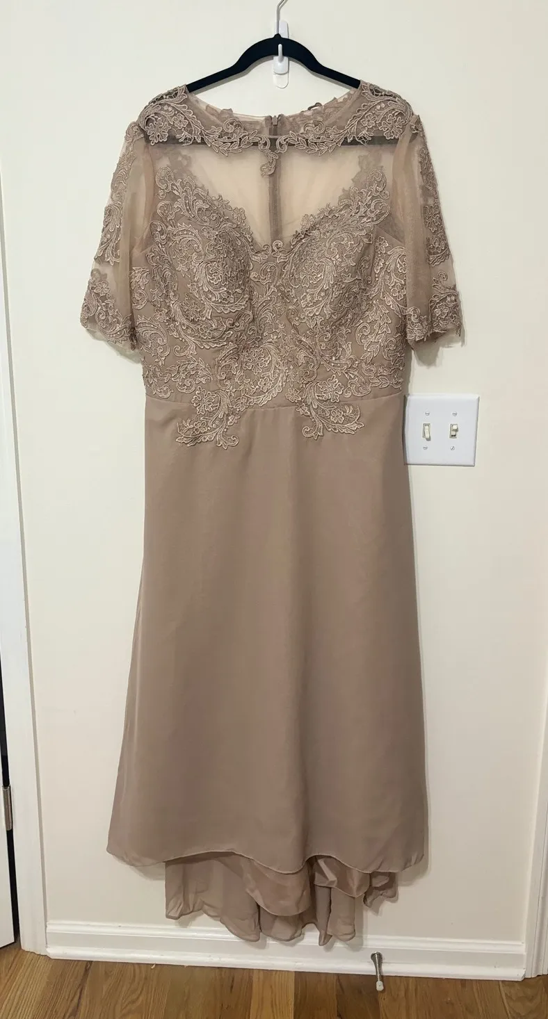 Elegance unfolds in this Grace Gallery formal dress, a vision of sophistication perfect for your next special occasion. Imagine yourself gliding through a ballroom, the delicate lace bodice catching the light with every move. The intricate floral lace detailing cascades across the sheer neckline and short sleeves, adding a touch of romance and refinement. The flowing skirt drapes beautifully, creating a flattering silhouette that will make you feel confident and poised. This gown is ideal for a mother of the bride, a formal evening event, or a sophisticated cocktail party. Style: Dress Color: Beige Keywords: Grace Gallery dress, formal dress, special occasion dress, lace bodice dress, evening gown, mother of the bride dress, chiffon dress, beige dress, size 16 dress, wedding guest dress, cocktail dress, formal gown, lace dress, short sleeve dress