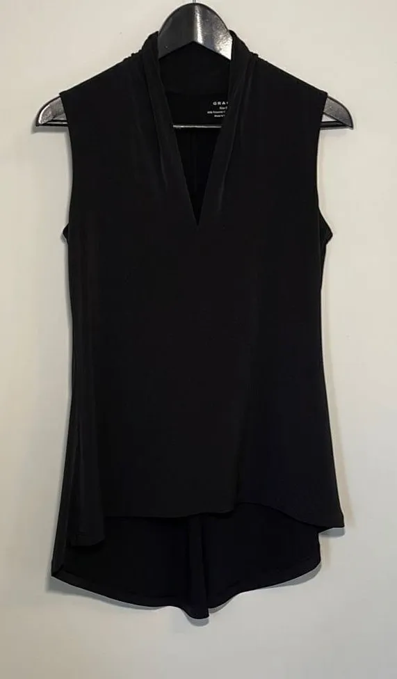 Description: Grace Women's V Neck Blouse Sleeveless Hi Low Hem Flowy Top Black Size Small. Stretch Fabric Shirt Regular Fit. Features: Brand: Grace Type: Blouse Style: V Neck, Sleeveless Size: Small Color: Black Material: 95% Polyester 5% Spandex Condition: Excellent pre-owned! All measurements are done laying flat and are approximate. Pit to pit 17" Length 29" Thank you for browsing my closet. If you have any questions feel free to message me. 5 star seller ⭐️ Bundle and Save 💰 Smoke free home 🏠 Next day ship 📦