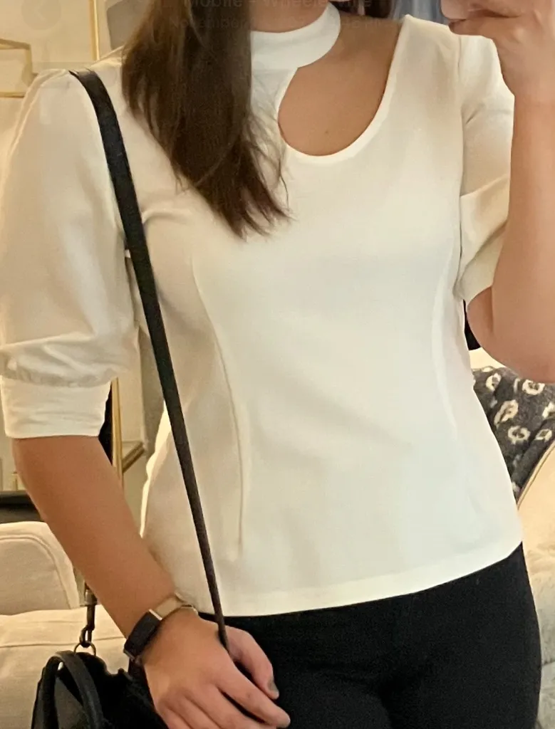 gracia white blouse size large cut out neck, asymmetrical neckline worn once This elegant cream top features a unique cut-out design and stylish half sleeves. Perfect for any occasion, it offers a chic and modern look.