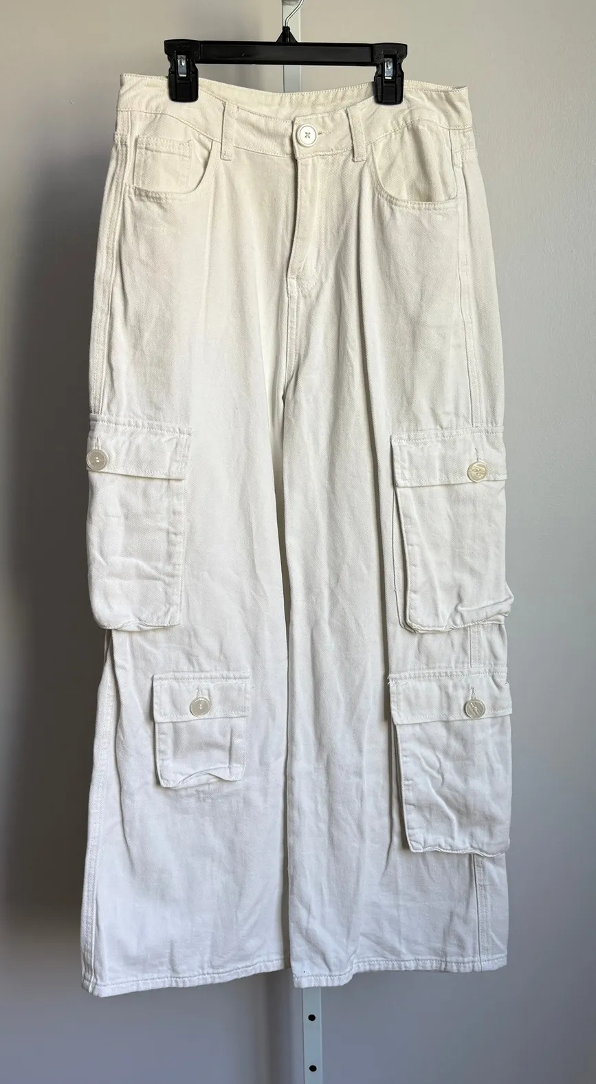 Gracia Womens Beige Wide Leg High Rise Cargo Pants Cotton Utility Trousers Gently used with no flaws. Contemporary-style cargo pants designed for versatile wear, distinguished by their wide-leg silhouette and high-rise waist that combine comfort with modern appeal. These trousers feature a classic five-pocket design complemented by functional cargo pockets on each leg, secured with button closures for added utility and style. The pants are finished with a neutral-toned fabric and traditional button and zip-fly closure, making them suitable for casual outings or as a stylish alternative to conventional bottoms. Keywords: cargo pants, womens cargo pants, beige cargo pants, wide leg pants, high rise pants, utility pants, cotton pants, trousers, womens trousers, casual pants, streetwear pants, Gracia pants, cargo trousers, beige trousers Measurements: Waist: 28" Hips: 38" Length: 39" Inseam: 23" Weight: 1 lb 7 oz SKU: AB32