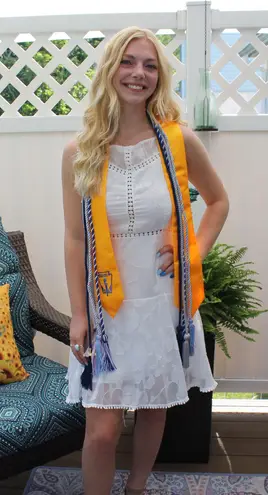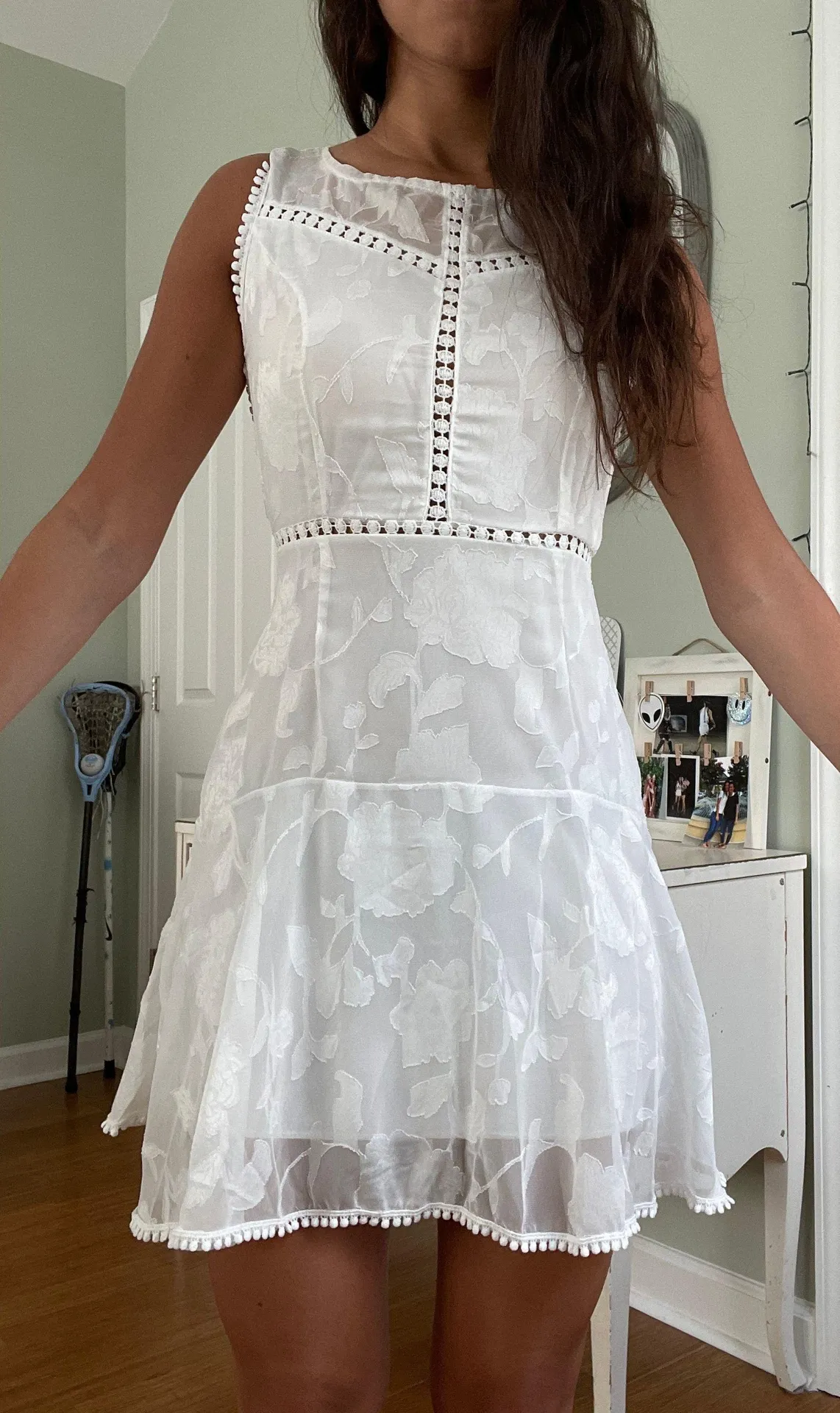 Prefect simple flowery dress for graduation or any occasion!! Reselling and worn twice for 2 graduation pics. So flattering! There is a small rip on the side that was there when I brought it from the first seller. You cannot tell when you have it on and it’s not noticeable! -Has a layer underneath -nice airy material **Message me for questions**