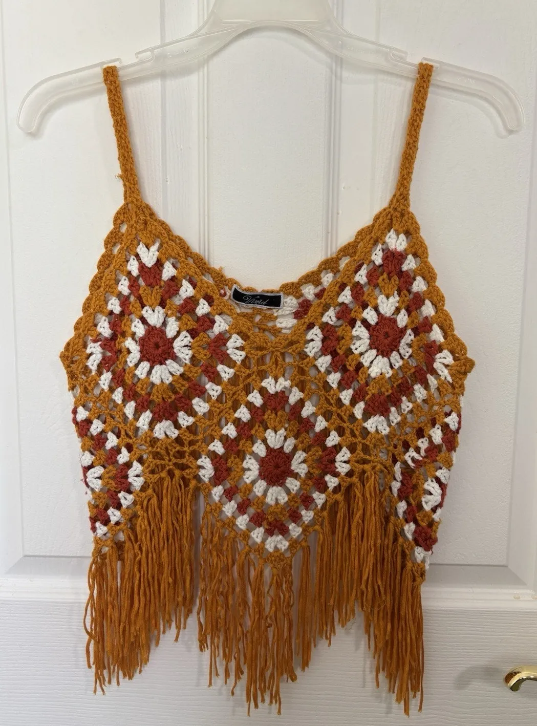 Vivid Fully Crocheted Crop top Tassel Details Size Tag is missing measurements are below 100% Acrylic Orange Red and White yarn Length w/o tassels 11” Length with tassels 17” Pit to pit 16.5” Crochet top, crop top, granny squares, boho, bohemian, tassel, fringe, festival, indie, contemporary, going out top, Coachella, lollapalooza, stagecoach, beachy, coastal, hippie Q007