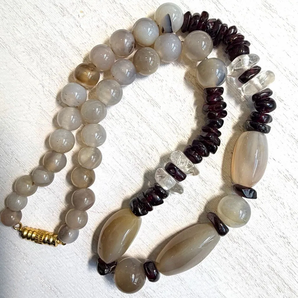 Natural Stone Beautiful natural stone beaded necklace featuring soft gray chalcedony and banded agate beads paired with deep wine-colored garnet chips and clear quartz spacers. The mix of translucent grays and rich garnet tones gives this piece an earthy, elegant look with great texture and depth. This necklace has a balanced, organic design and feels substantial without being heavy. Finished with a gold-tone screw barrel clasp for secure wear. Garnet is often associated with grounding and strength, while chalcedony is linked to calm and balance. Good preowned condition with natural inclusions and variation typical of genuine stone ✨ Photos are part of the description. Reasonable offers welcome! Bundle to save! Free gift with a purchase of 3 or more items Same or next day shipping. #chalcedony #agate #garnet #naturalstonejewelry #beadednecklace #earthyjewelry #bohojewelry #statementnecklace