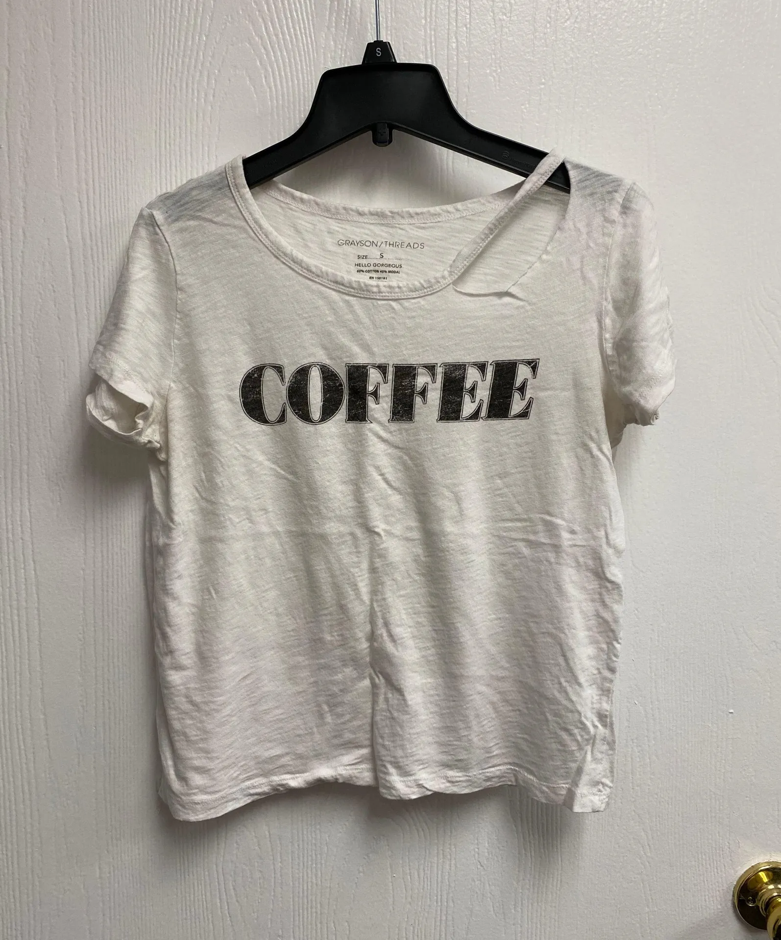 White coffee graphic tee from Grayson threads. Size small. Has cutout on the front shoulder collar b... Show more